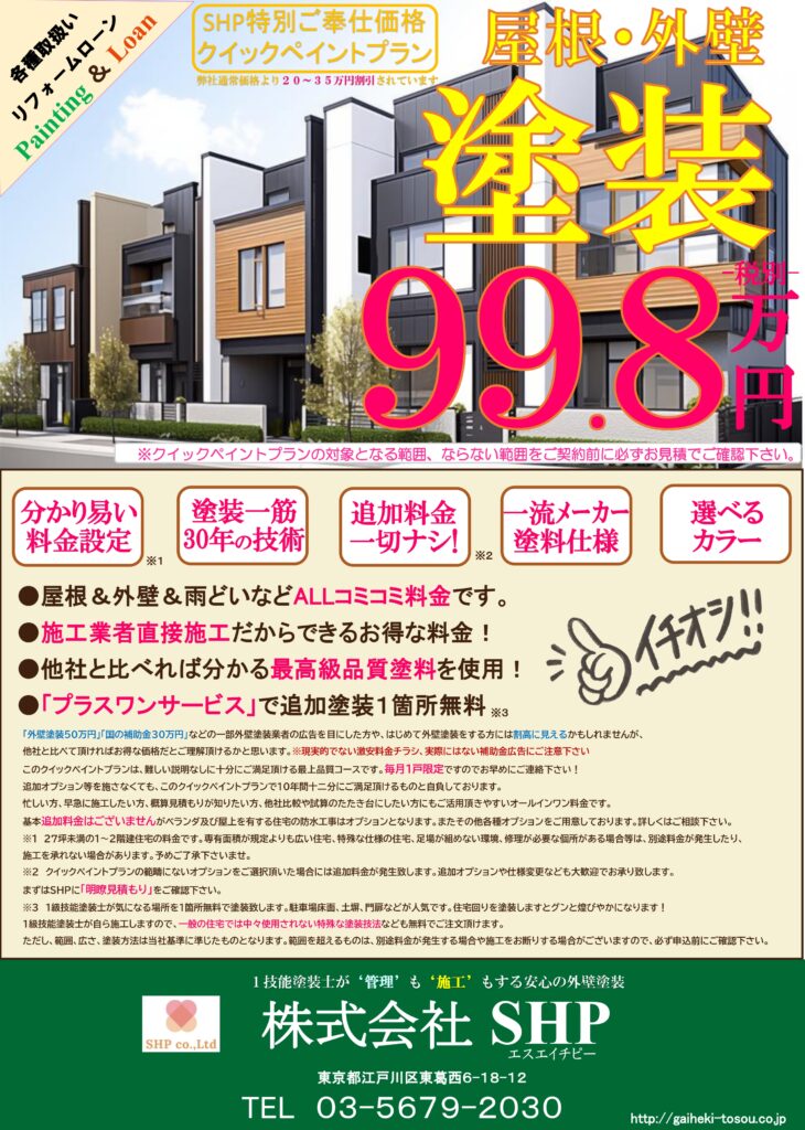 世の中には様々な外壁塗装業者がありますが、業界統一の外壁塗装チラシはありません。よってドアノック商品として激安広告を打って、絶対に必要となる箇所をオプション料金で上乗せして利益を確保しようとする業者もいます。SHPではお客様1回1社に限り無料で他社見積の内容解説をさせて頂きます。「お客様の希望どおりか否か」一緒にチェックしましょう。